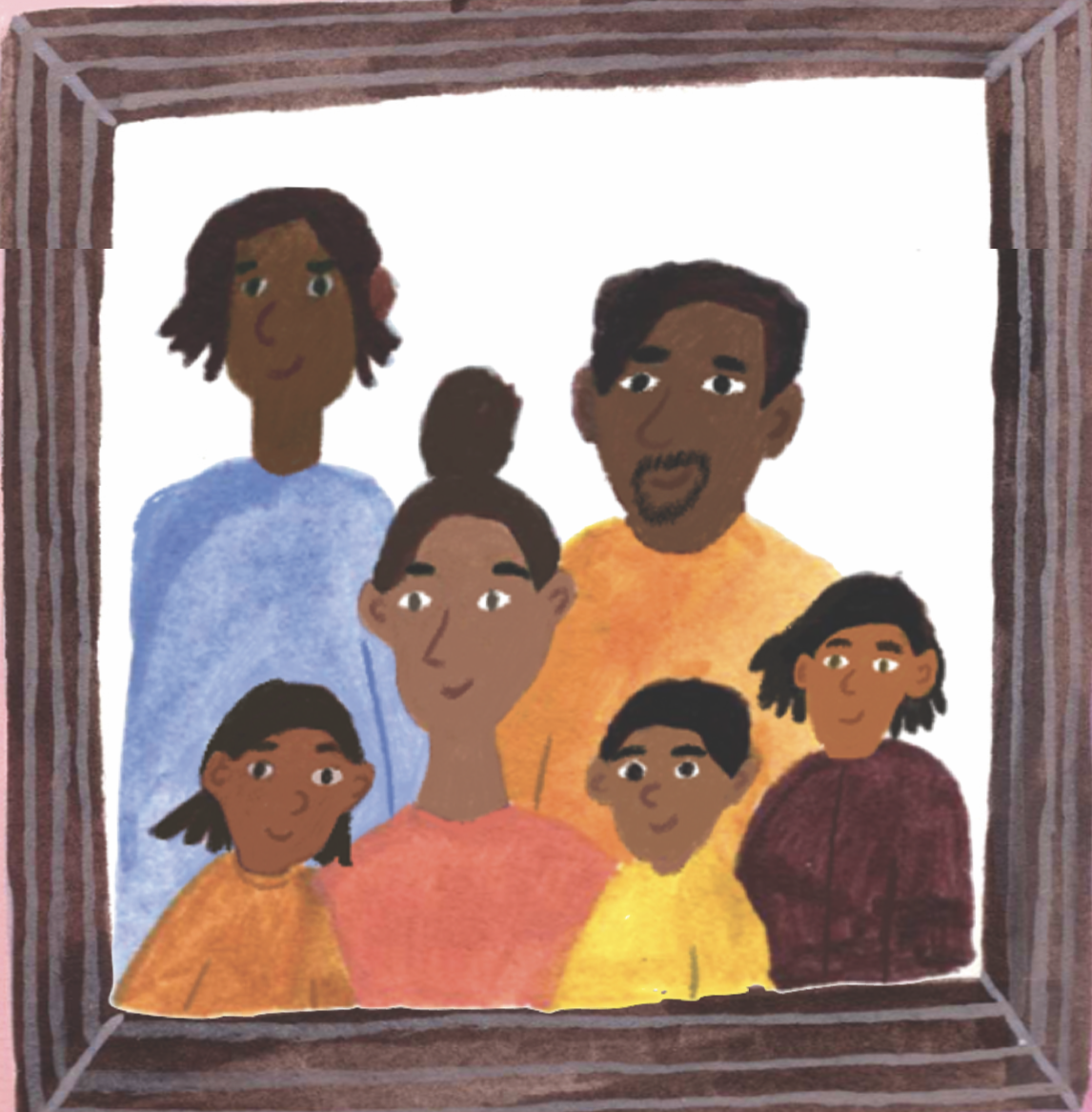 Illustration of Kimberly and her family: sons Zion, Mathias, Omari, Kroix and husband, Shomari.